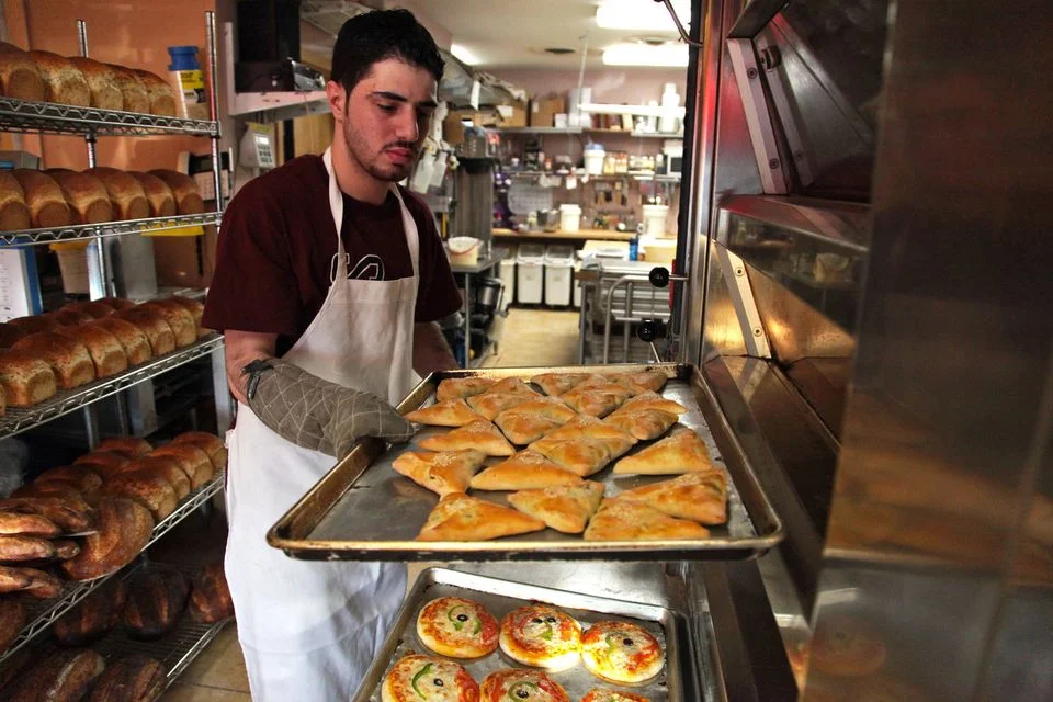 Molhem Tayara retrieves a cooking sheet holding zatar, a Syrian baked good, from the oven at the Victorian Bakery. Tayara, a refugee from Syria, has been baking goods every Saturday morning to help support his family.