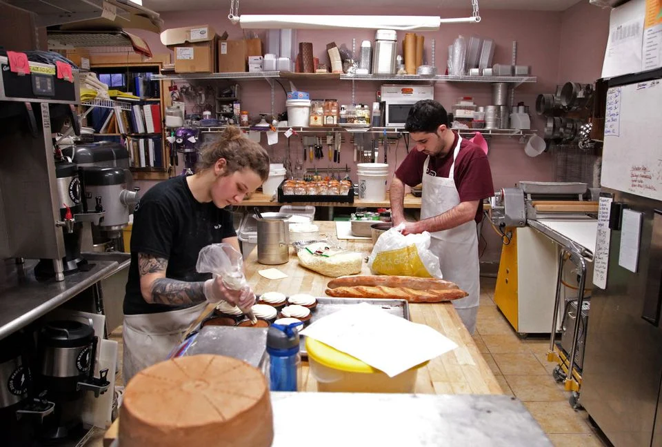 Sierra Henley, left, and Molhem Tayara, right, share counter space as they prepare baked goods.